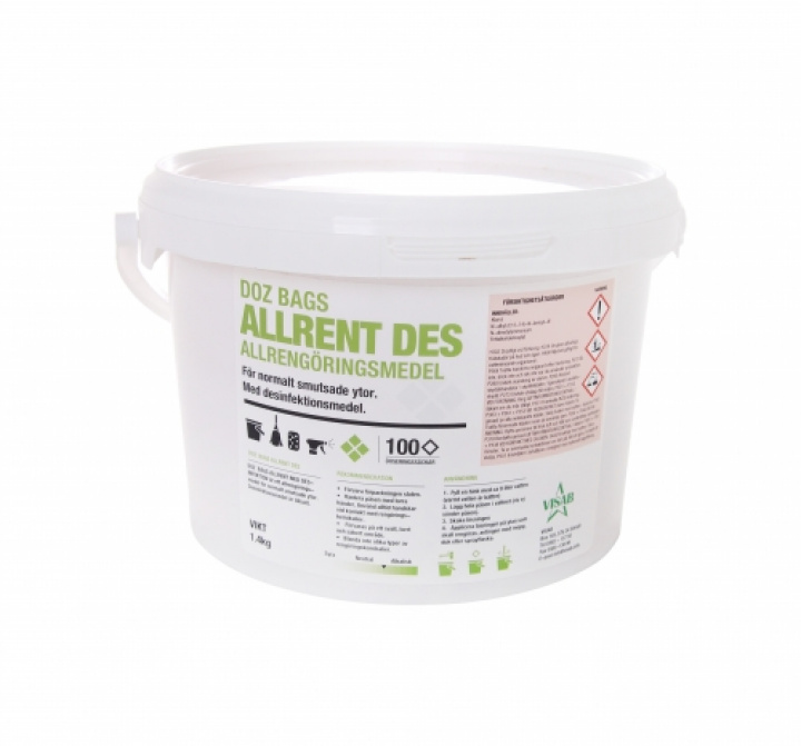 Doz Bags Allrent med desinfektionsmedel (grön dosering) är ett universellt rengöringsmedel för ytor som är normalt smutsade. Det löser effektivt upp smuts, fett, olja och proteiner. Dess desinfektionsegenskaper gör det lämpligt för områden där hög hygienstandard är viktigt. Produkten är oparfymerad.