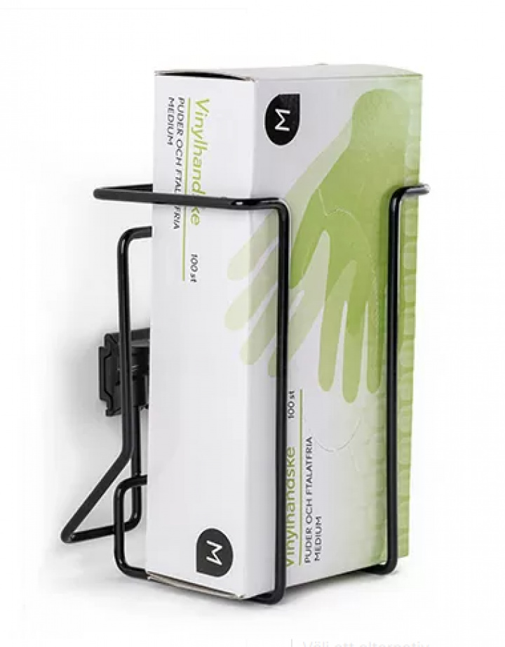 Hållare för kartong med engångshandskar (max B130 x D65 mm). Monteras på vägg med medföljande väggadapter, på städvagn med rörfäste eller på Toolflex One skena (köpes separat).