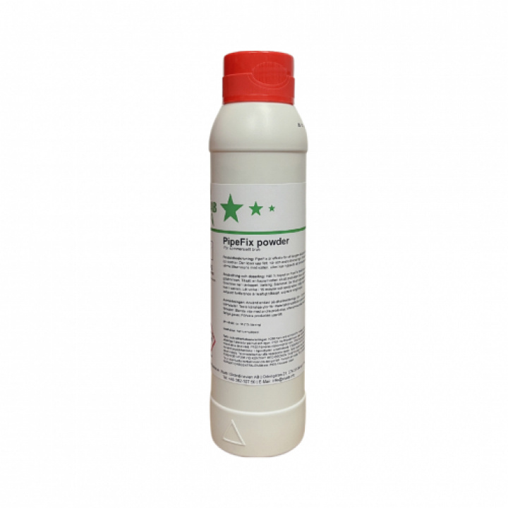 PipeFix ska endast användas på alkalibeständiga ytor och inte på lättmetaller. Utför förtester på känsliga ytor. Blanda inte med andra kemikalier, särskilt syror, då farliga gaser kan bildas. Följ alltid säkerhetsanvisningarna på etiketten. Produkten kan orsaka frätskador och är farlig vid hud- och ögonkontakt. Använd skyddsutrustning. Vid olycka, följ instruktionerna på etiketten och kontakta giftinformationscentralen.