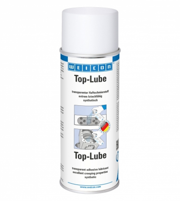 WEICON Top-Lube är ett syntetiskt, transparentt limsmörjmedel för permanent smörjning av alla typer av högt belastade mekaniska delar. WEICON Top-Lube har hög vidhäftnings- och spinnstyrka och utmärkt kapillärverkan. Det är tryckbeständigt, vattenavvisande, temperaturbeständigt från -40 upp till +200°C och kan också användas under pågående drift i enlighet med de respektive säkerhetsföreskrifter. Det angriper inte följande plaster och elastomerer: PTFE, PE, PA, fluorerad, butadiengummi och silikongummi, och polykloropren. Följande material har en begränsad motståndskraft: PE-LD, POM, PP, NBR. WEICON Top-Lube kan användas på kraftöverförande bultar, kugghjul och snäckväxlar, höghastighetsmaskindelar, fogar och kopplingar, hjul och lager och fjädermonteringar i många industriella sektorer.